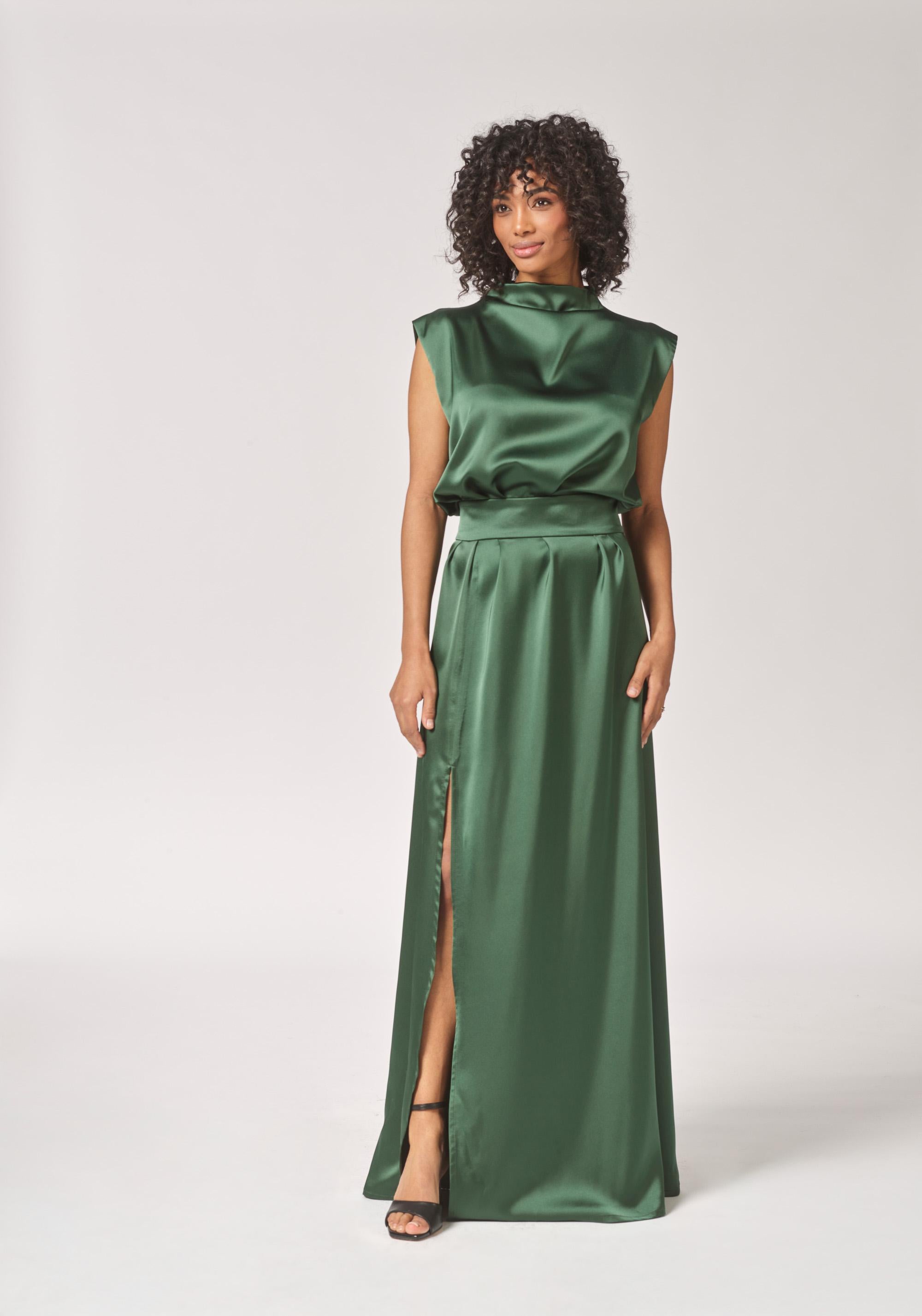 Satijnen avondjurk met split - Bottlegreen