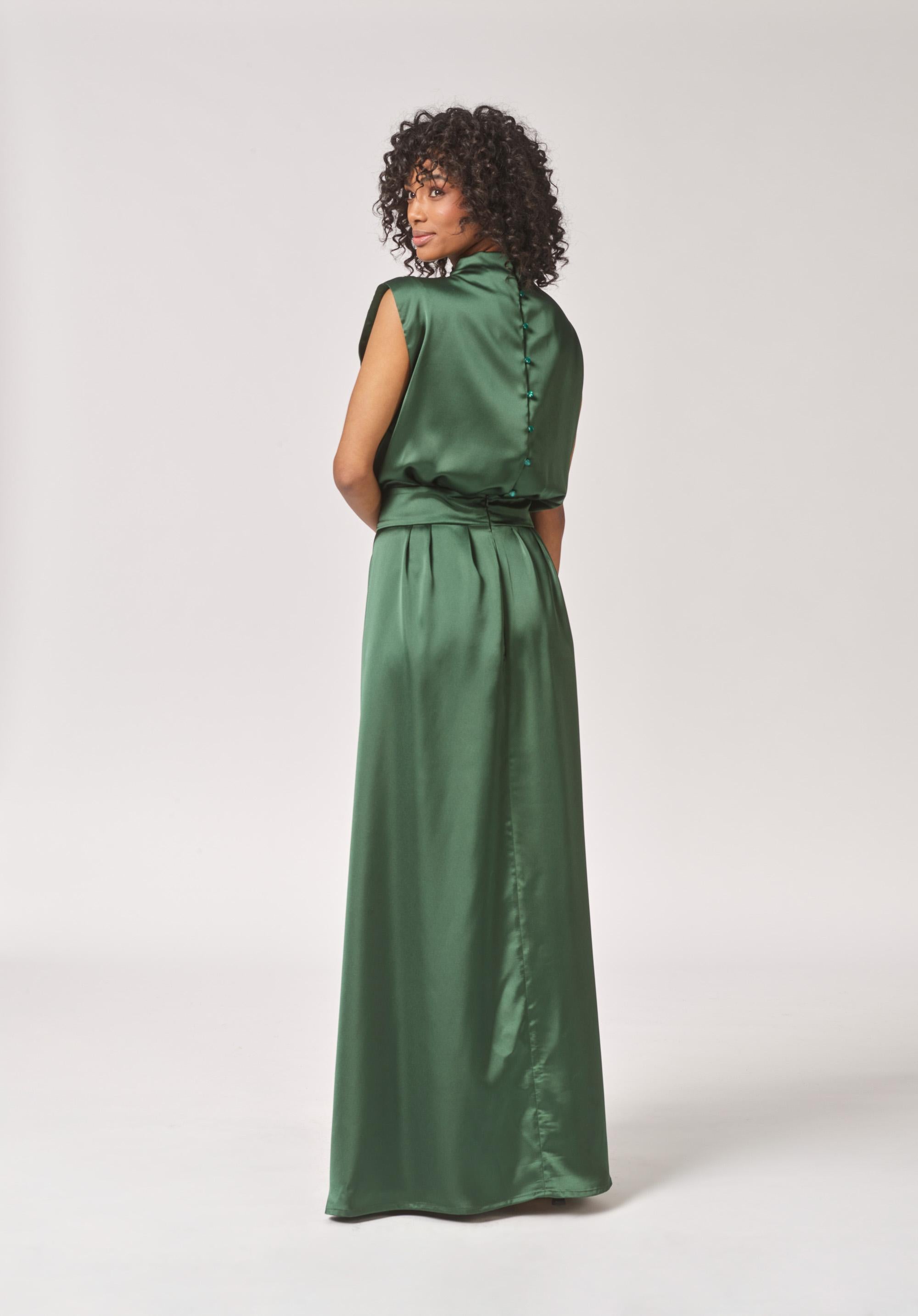 Deze lange, satijnen jurk is dé ultieme keuze voor een chique avond of speciale gelegenheid zoals een trouw, galabal... Het luxe satijn valt prachtig en de knoopsluiting op de rug is de ster van de avond!