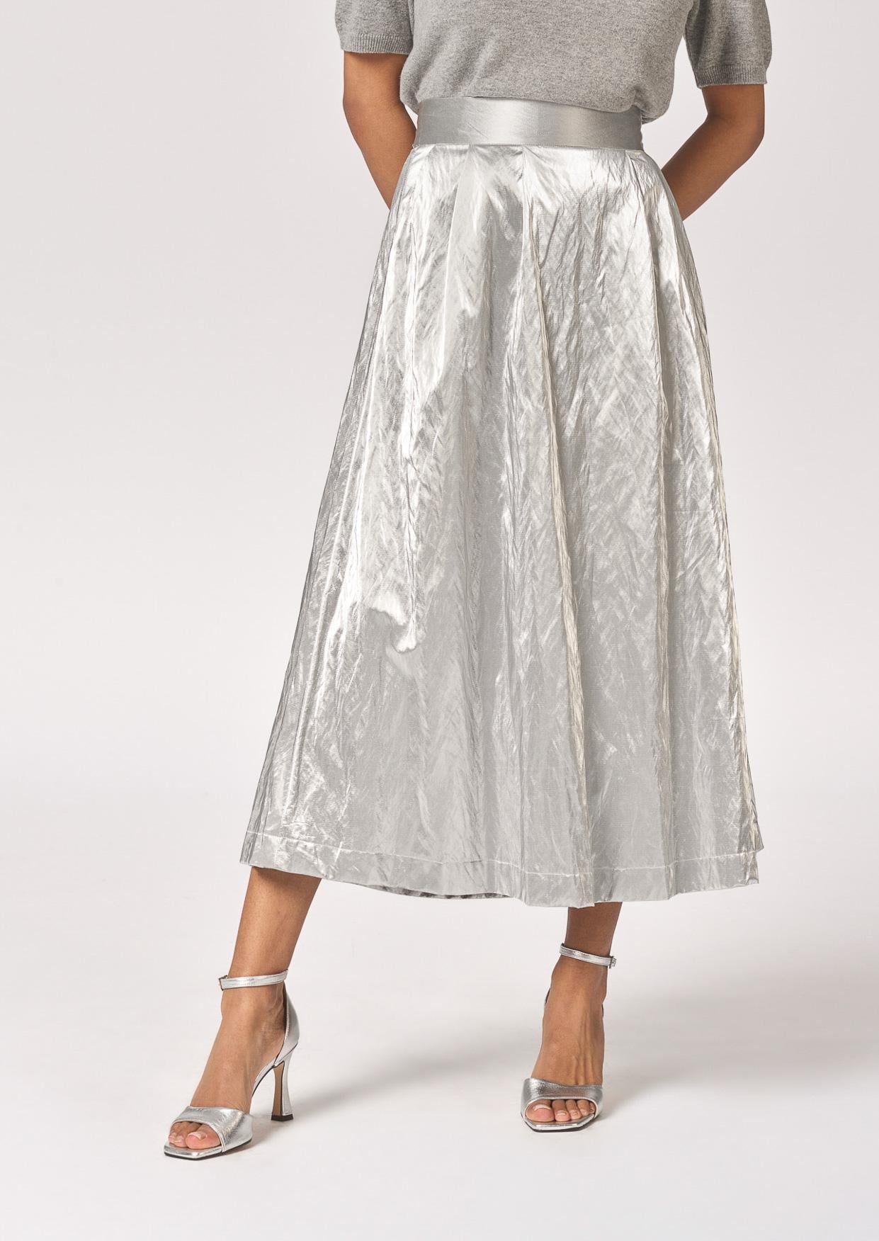 Deze lange zilveren rok heeft een flatterende A-lijn vorm. De rok valt wijder uit. Met een tailleband die de rok mooi op zijn plaats houdt, wordt je silhouet geaccentueerd op een subtiele manier. De lichte plooitjes aan zowel de voor- als achterkant voegen extra volume en een verfijnd detail toe aan het ontwerp.
