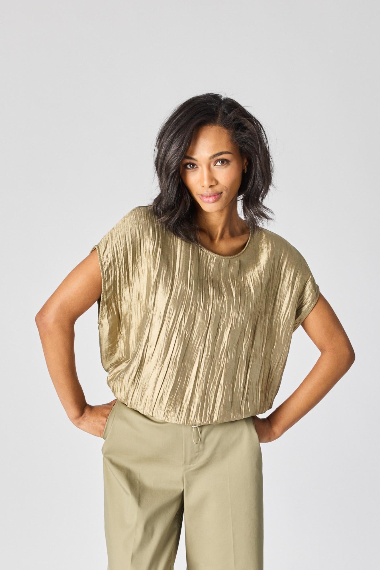 De COLETTE top in frippé is een speels, kort model. De frippé stof zorgt voor een subtiele, elegante textuur, terwijl de rekker in de zoom het topje een mooie blousende pasvorm geeft.